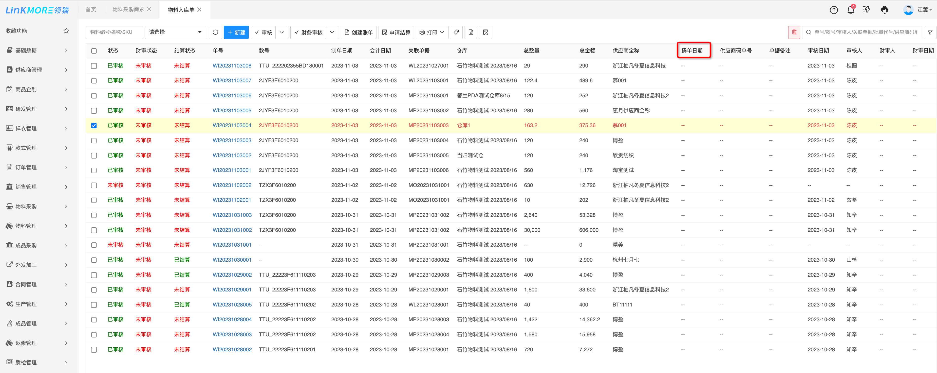 功能说明:列表增加“码单日期”,取值物料入库单编辑页面的码单日期