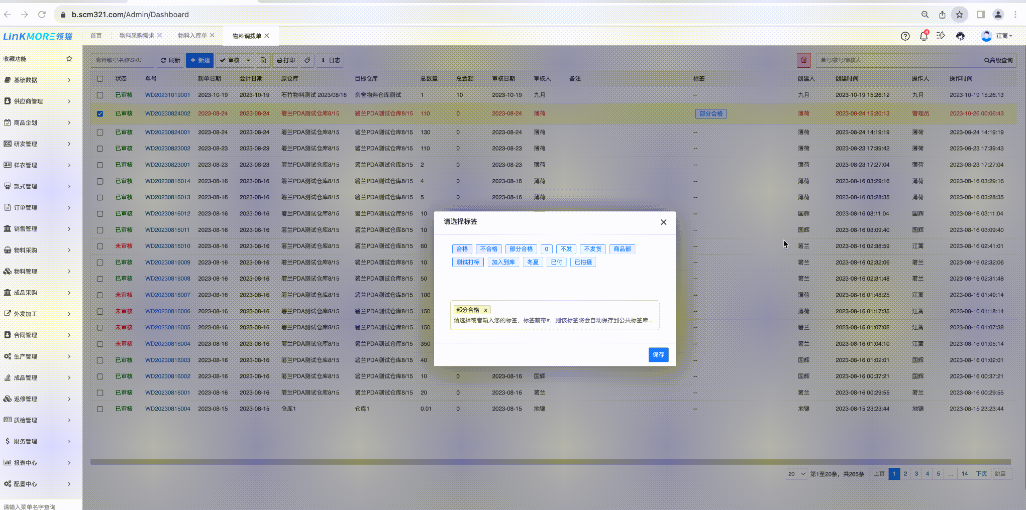 功能说明:增加打标功能,支持针对某个调拨单进行打标签