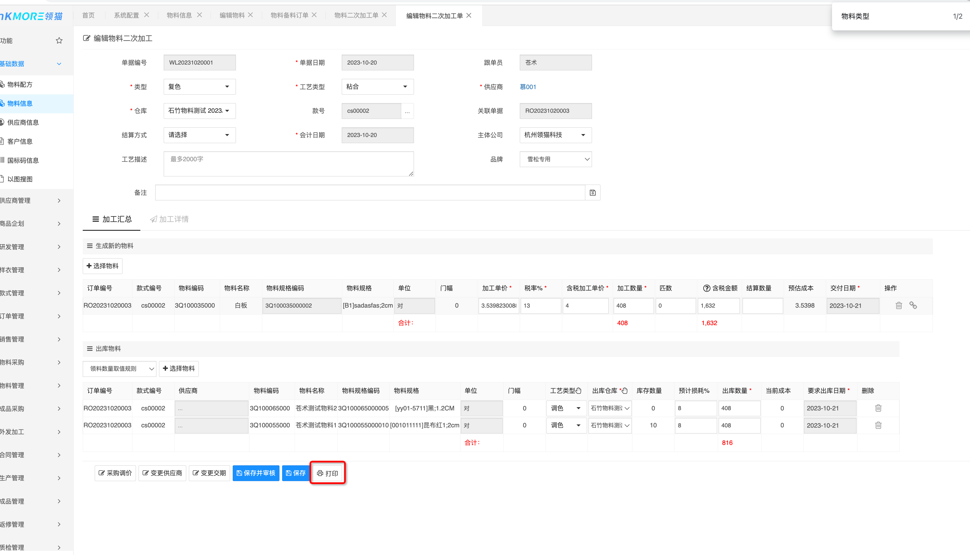 功能说明:编辑页面增加打印按钮,支持打印二次加工单