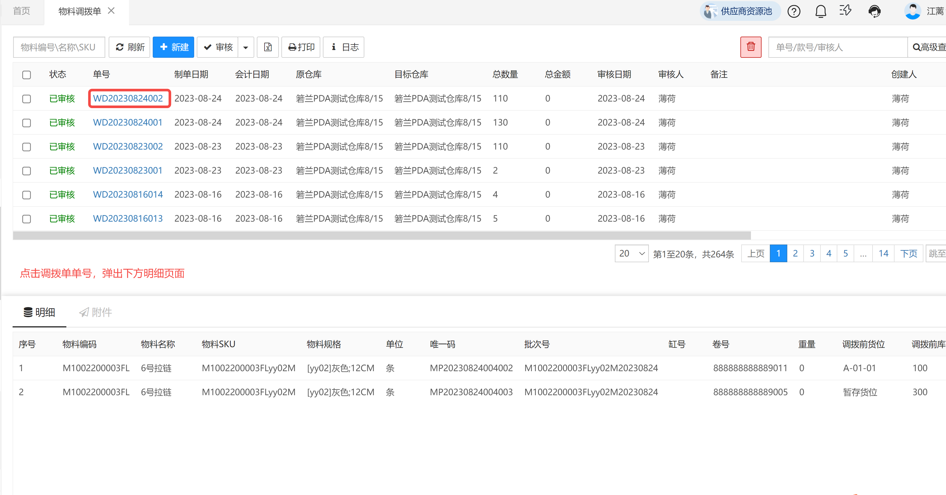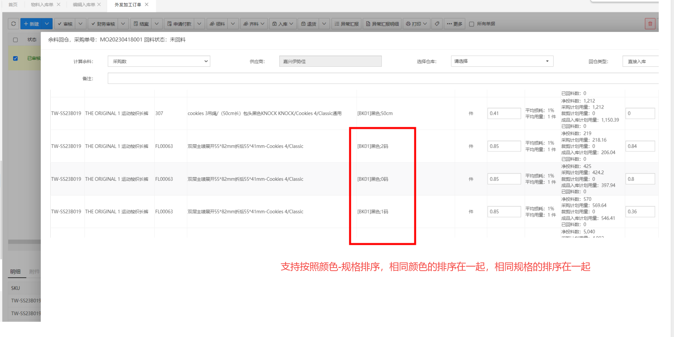 功能说明:余料回仓页面支持按照物料编码-相同颜色-相同规格的物料排序在一起
