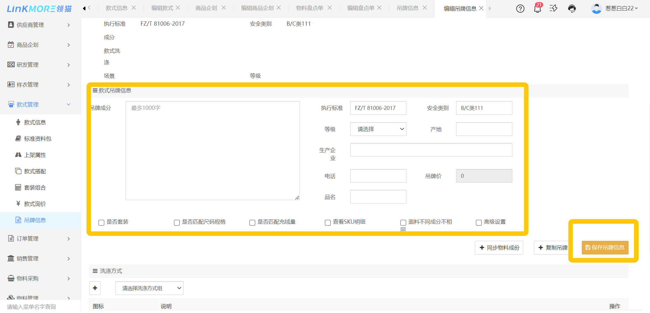 功能说明:吊牌信息里,黄颜色的保存按钮,只校验当前区域,字段的必填。